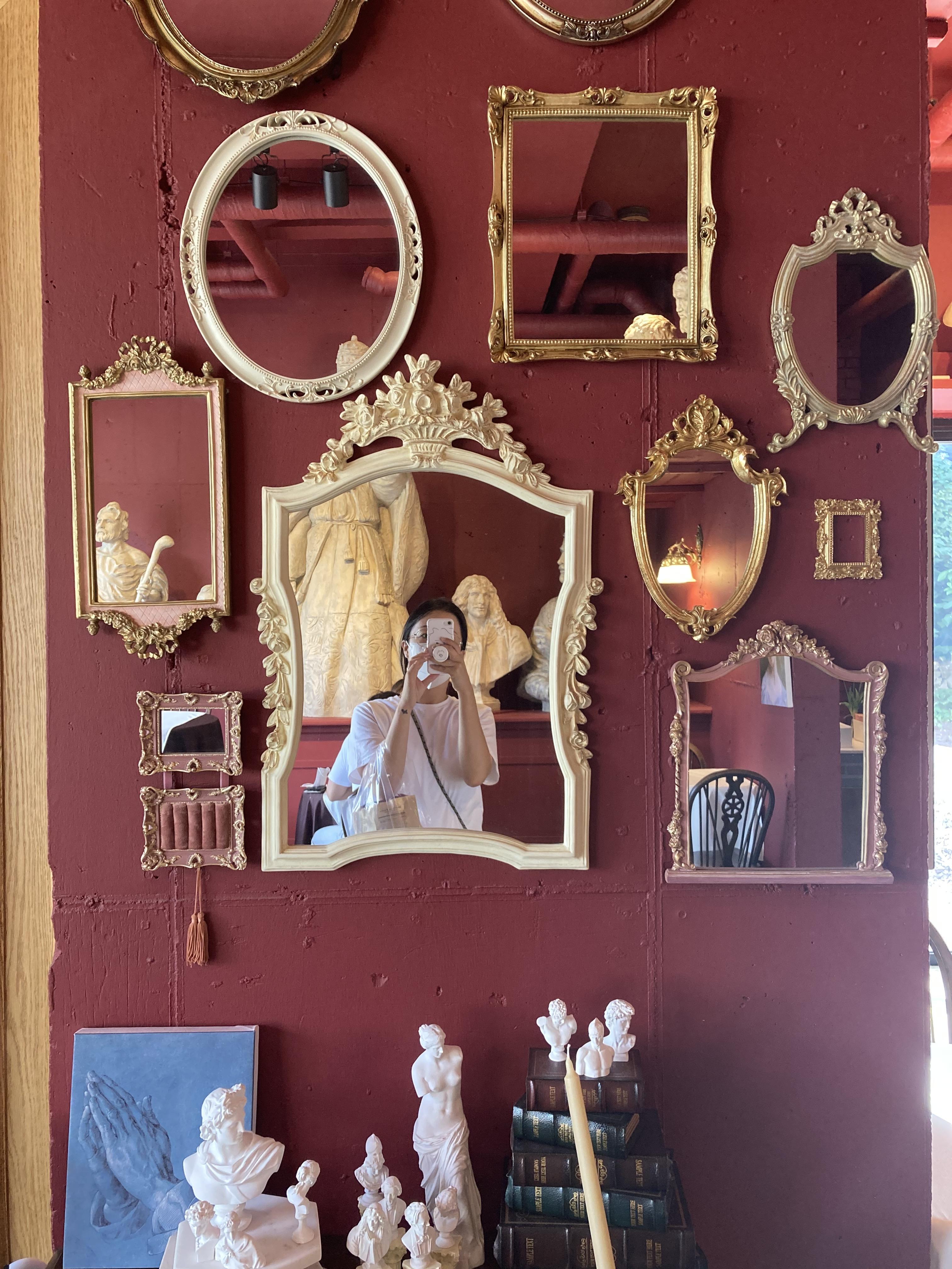 카페 곳곳에 조각상들이 있어요. 그리고 야외테이블도 있어요.! 날이 너무 더워서 에어컨 빵빵한 실내에서 먹기로 했어요.