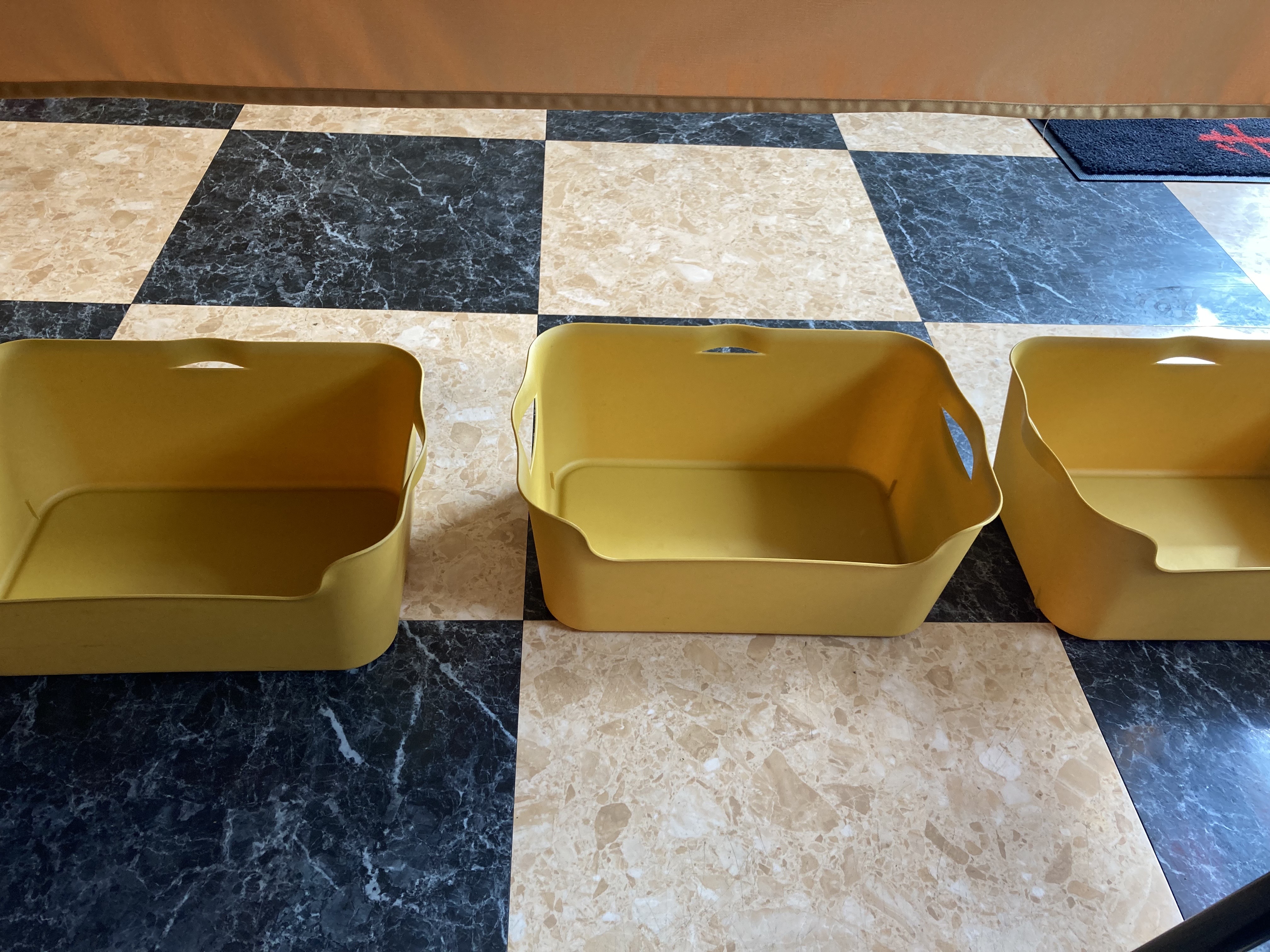 발 밑에는 소지품 넣을 수 있게 통 있고요. 벽면에는 일회용 앞치마가 있어요.