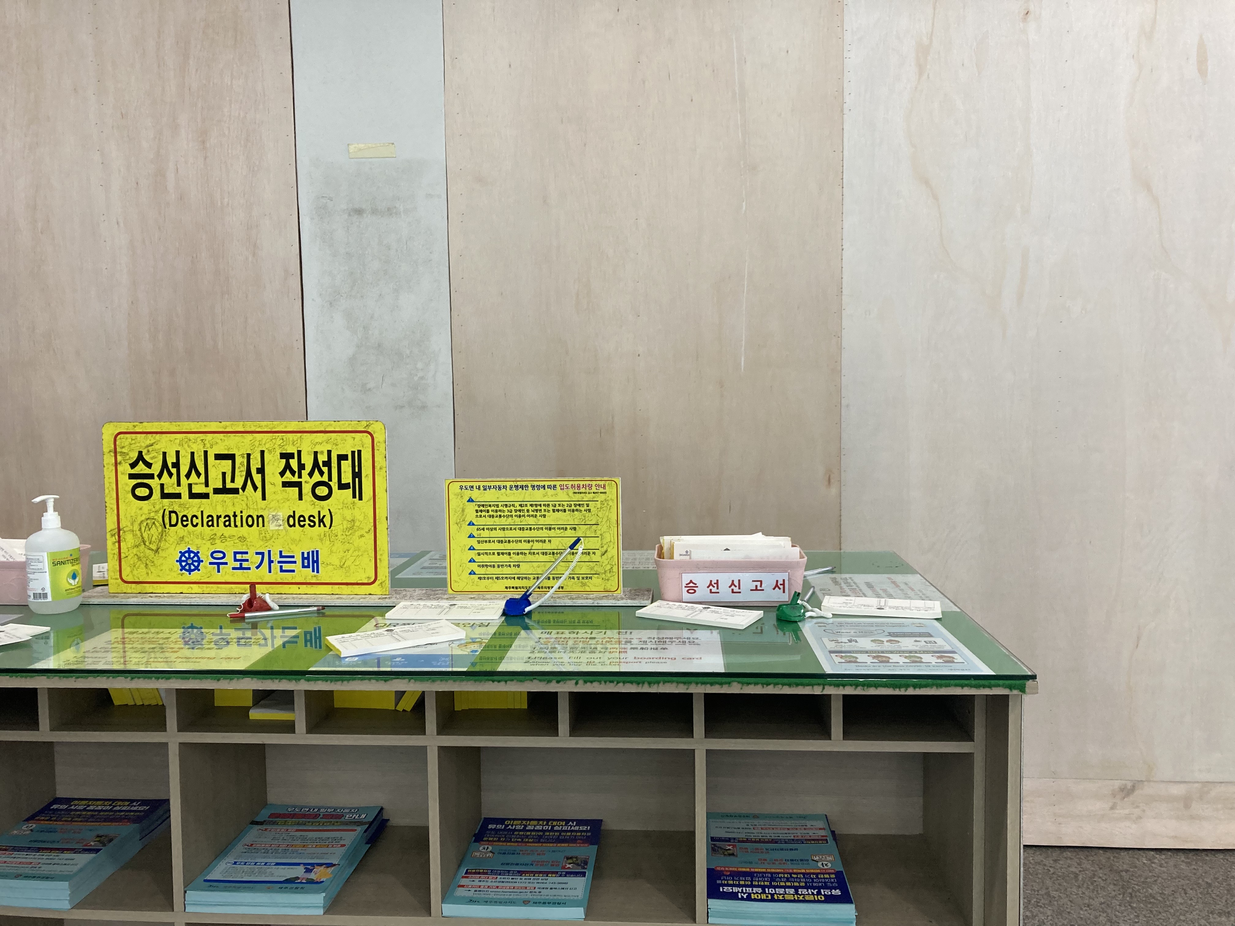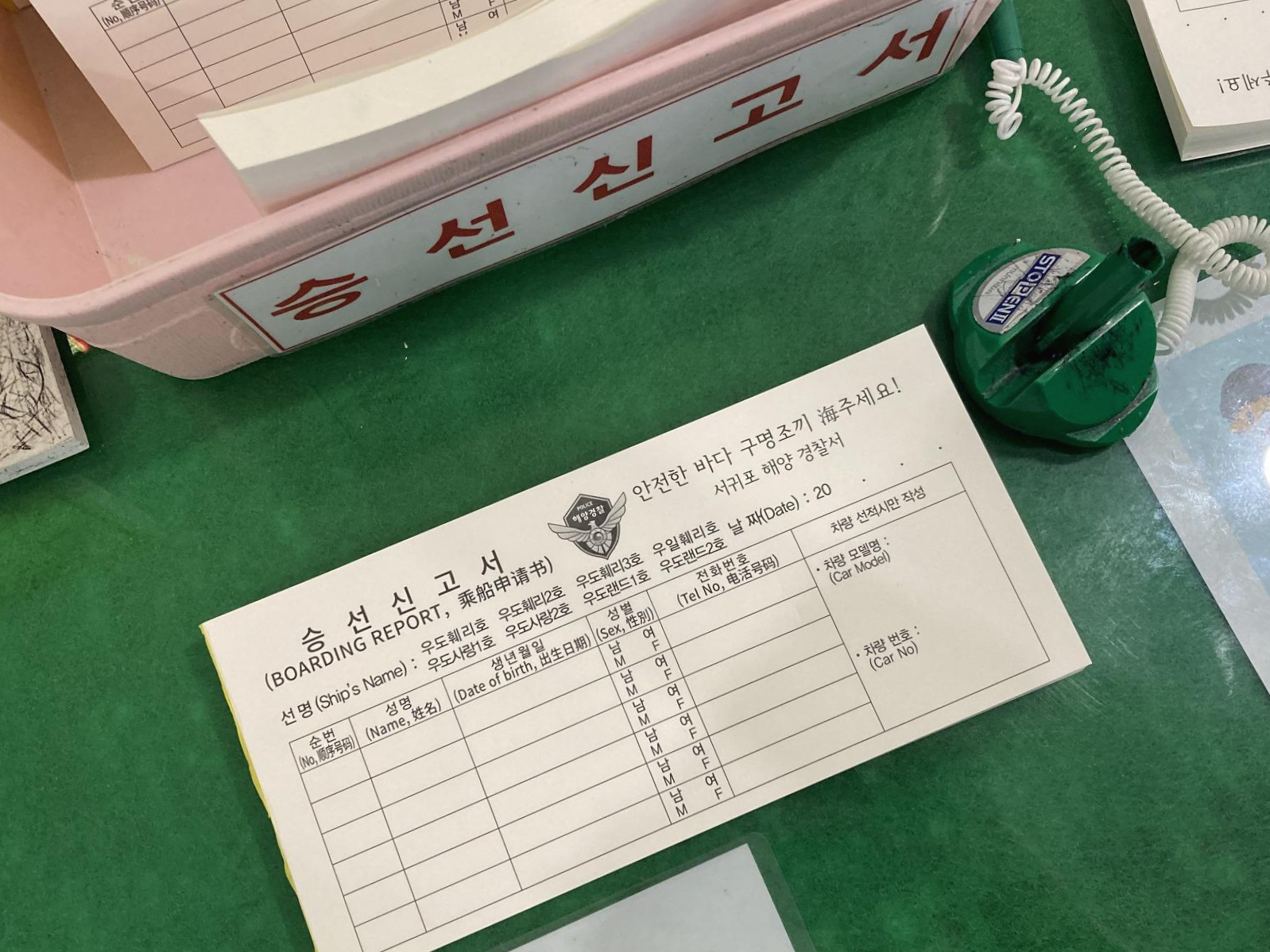 승선신고서 작성대에서 승선신고서를 2부 작성 후,