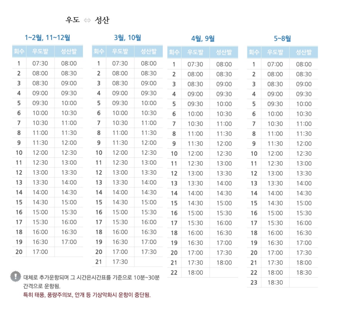 그리고 달마다 우도 ↔성산 첫배와 마지막 배 시간이 조금씩 다르니 참고해주세요!