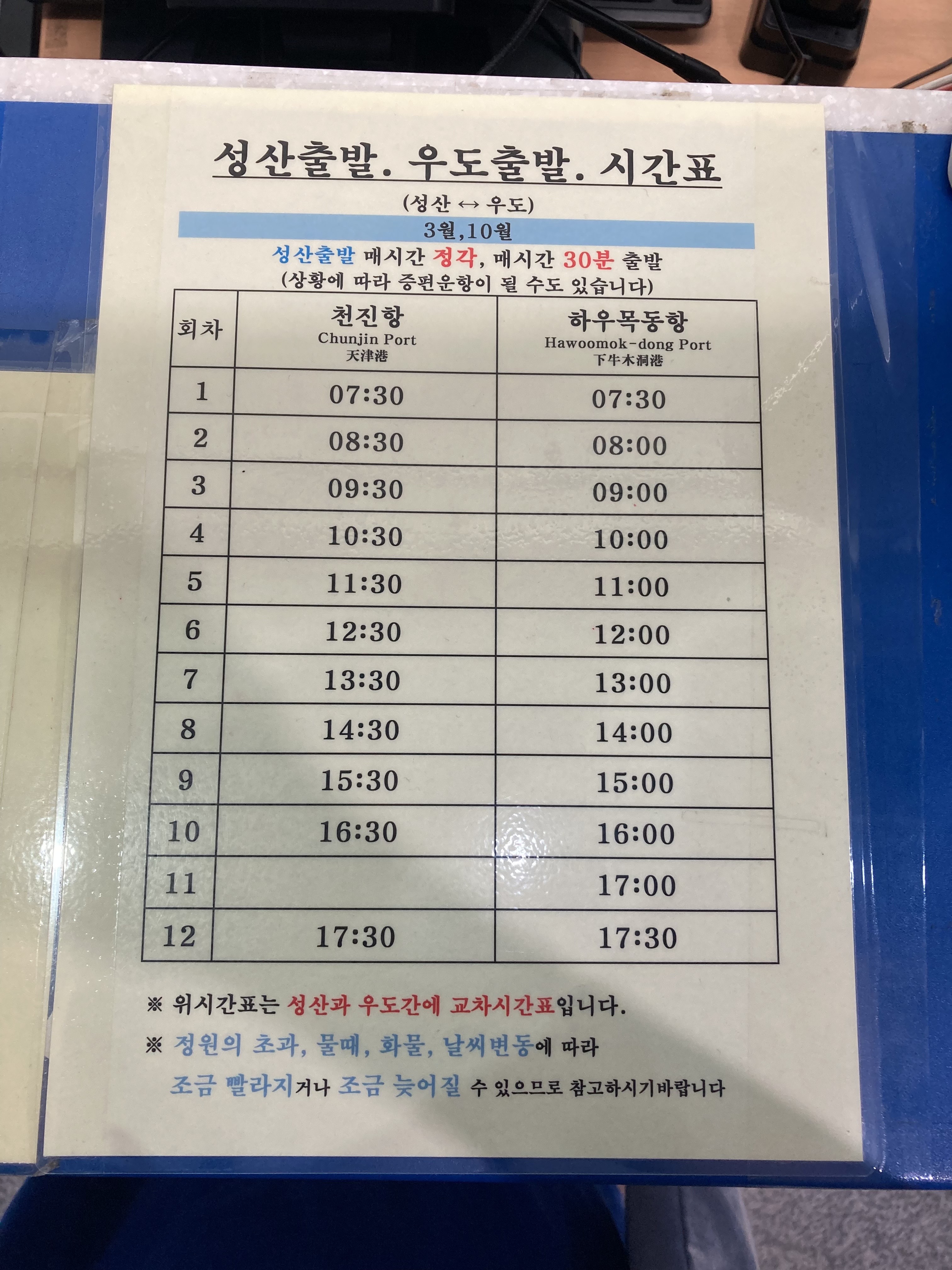성산항출발 천진항은 매시간30분 , 하우목동항은 정시입니다.
