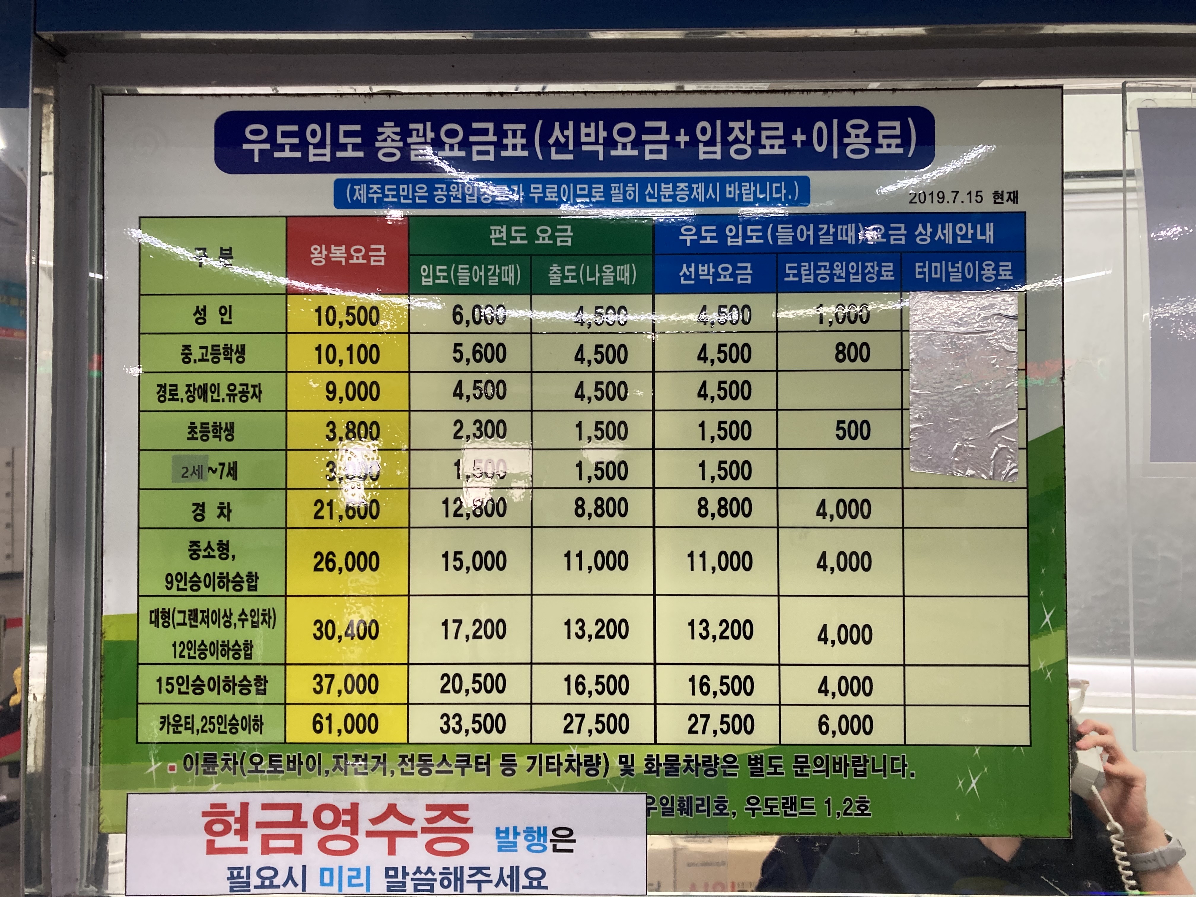 성인 1인 우도 왕복 선박 요금 9,000원 + 입장료 1,000원 총 10,000원입니다.